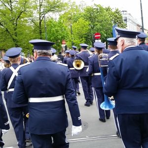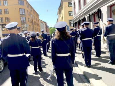 Vi finpusser marsjformen før 17. mai med en marsjøvelse rett etter konserten foran Sagene kirke. Øvelsen ble ledet av leder for Marinemusikken Sten Kristian Brath.