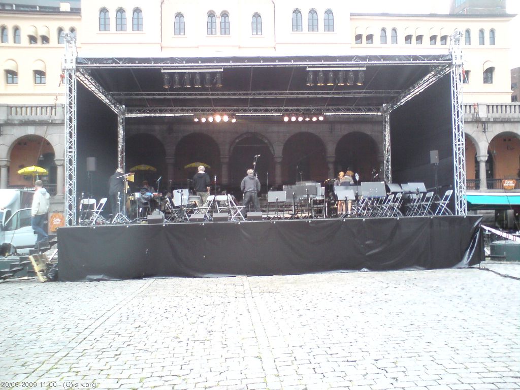 Mye tid var brukt til øving og vår utrettelige dirigent - Tom Skjellum - hadde arrangert opp 7 Abba-låter som skulle fremføres med solister og korister fra Mamma Mia musicalen i Folketeateret. Lørdagen begynte med lydprøve på formiddagen før solisten skulle tilbake til teateret og en dobbel forestilling, før de igjen slulle være med oss. Enkelte bange anelser gjorde seg gjeldene da de første regndryppene kom i det lydprøven var ferdig. Sist vi spilte Fyrverkerikonsert var det ganske vått, noe som begrenset antallet publikummer kraftig. Utover lørdag ettermiddag regnet det tildels voldsomt, men da tiden for konserten nærmet seg - klarnet været opp