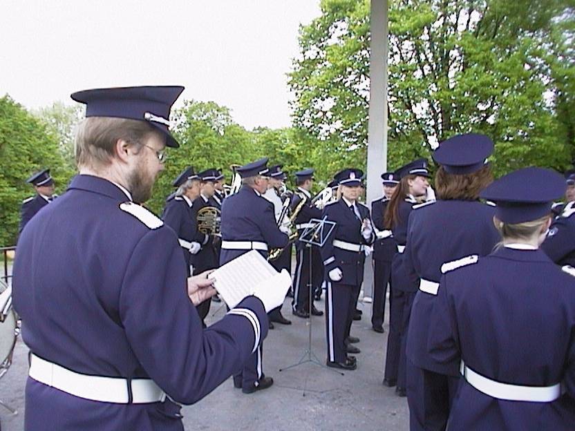 Det er rett før "avspark" på denne ettermiddagsspillingen i Torshovparken. Trombonist Geir Trondsen i forgrunnen