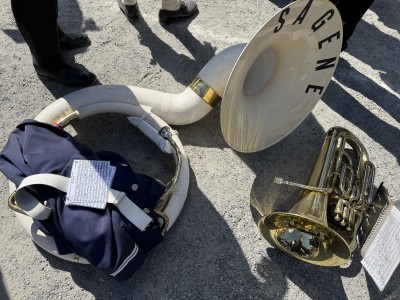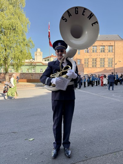 Ăyvind med pĂ„montert susafon klar for dyst