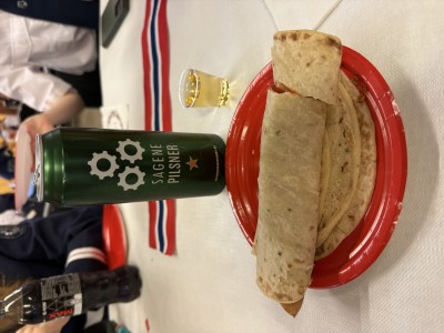 Etter flaggheising er det 17. maifrokost. Hva som stÄr pÄ menyen, gÄr nok fram av bildet. Kraftig kost mÄ til nÄr en lang dag stÄr for dÞren!