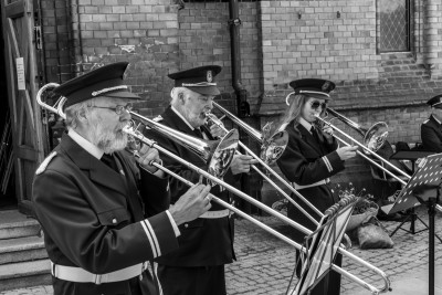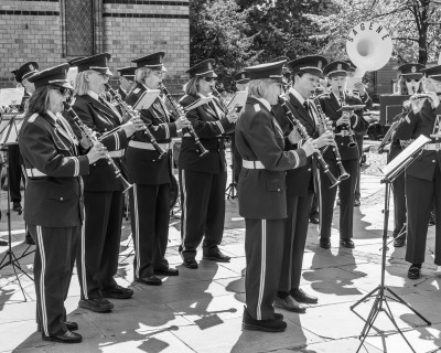 Konserten pÄ RÄdhusplassen i gang, her kornett/trompetrekka tatt pÄ fersken ..